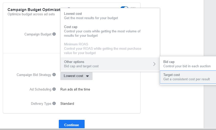 Facebook’s default setting is Lowest Cost.