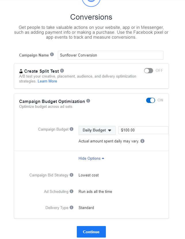 Depending on your objective (for example, my objective for Sunflowers was Conversions), you will get a list of possible ways to optimise your budget (via Campaign Bid Strategy), as shown below.
